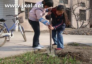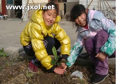 瞧,同学们你一锹,我一铲,挖好一个坑,小心翼翼地放下树苗,不敢用铁锹填土,生怕不小心伤着了树苗,女孩子一改平时的娇气,蹲下来用手小心地给树苗填土,压实;男孩子也没有了平时的鲁莽,细心地呵护着小树:扶苗、浇水……