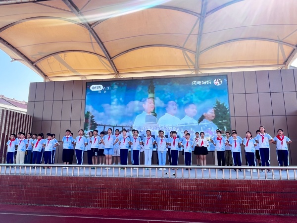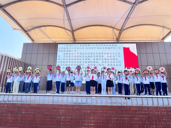 活动氛围随着音乐缓缓转变——六(3)中队全体队员齐唱《松花江上》,“我的家在东北松花江上,那里有我的同胞,还有那衰老的爹娘”的悲怆旋律在校园回荡,同学们神情凝重,眼中满是对历史的敬畏;大屏幕上同步播放着展现“九一八”事变背景的历史画面,破碎的家园、苦难的同胞,一幕幕场景将全体师生又带回到那个山河破碎、风雨如晦的年代,让在场每个人都深刻感受到历史的沉重。