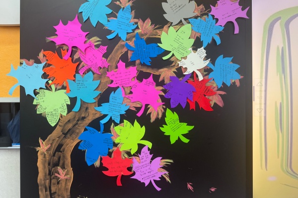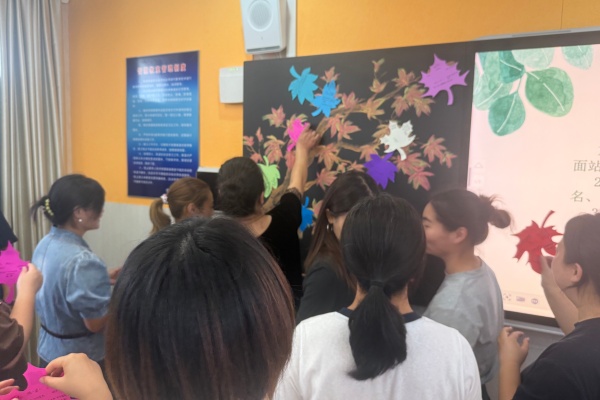 在“破冰启航·凝聚共识”环节,刘丹主任精心设计了“叶脉书写·识友”与“同心转动·话育”两项互动活动。26位家委会成员在枫叶形卡纸上郑重书写个人特长、可共享资源及育儿心得,通过内外圈轮转交流打破陌生感,在思维碰撞中凝聚教育共识。活动尾声,众人将写满心意的枫叶逐一贴于黑板,共同拼接成枝繁叶茂的“同心树”,直观展现家校携手共育的初心与决心。