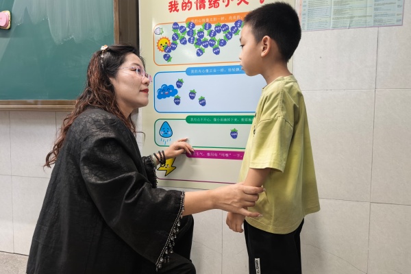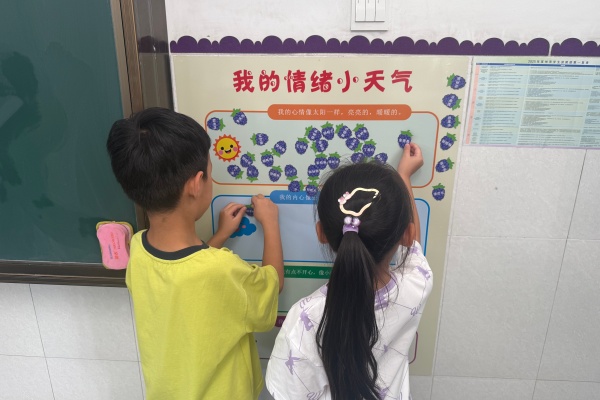 教室门口的“情绪小天气”晴雨表,划分太阳(开心)、云朵(平静)、小雨(难过)、闪电(生气)四个区域。每日清晨,学生用专属“小果实”磁贴自主标注情绪,教师快速识别状态,对情绪低落者及时开展“悄悄话时间”,倾听疏导。每周情绪数据统计更有助于教师把握整体,实施针对性引导。一月以来,学生更愿表达情绪,班级氛围更显和谐。